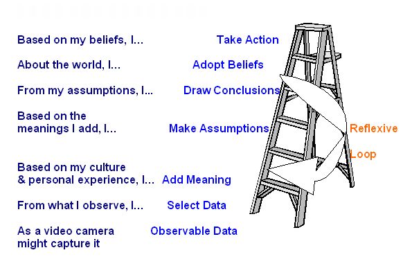 I am talking about a tool that your mind uses called, the Ladder of Inference. It’s our thinking process we all go through at nearly every point of every day. It is how we process data (automatically) and make sense (our sense) of the world. Understanding the Ladder will help you in every aspect or any social interaction that you have.