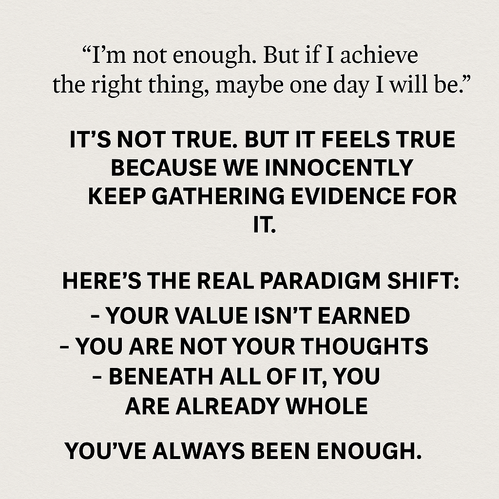 From then on, the brain becomes a lawyer for this false belief—constantly gathering evidence, presenting case after case in the courtroom of our minds. See? You failed. Not enough. See? You didn’t get recognition. Not enough.